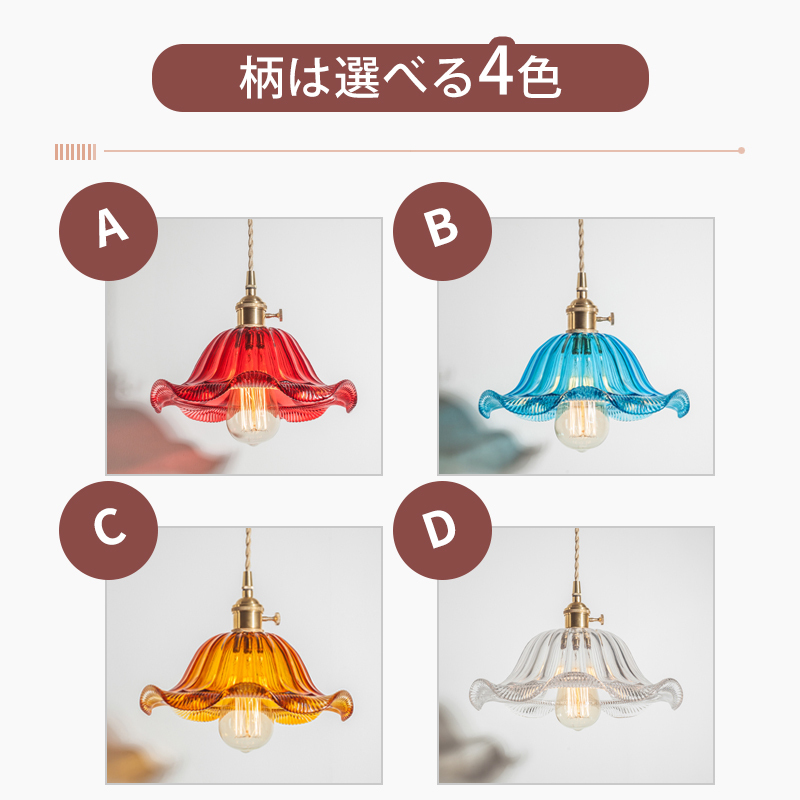 手吹きで作られた花びら形のガラスシェードを採用し、赤・青・オレンジ・透明の4色から選択可能。ガラスの自然な波紋やシワが光を柔らかく拡散させ、点灯時に空間に美しい彩りとアート感を演出します。