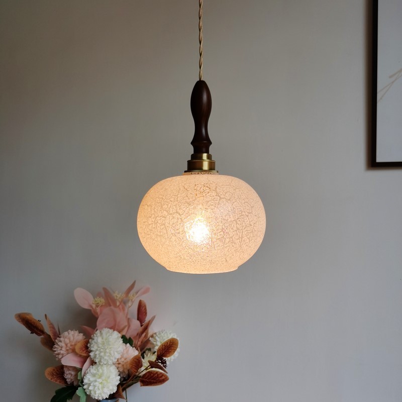 ガラスシェードを通して光が柔らかく広がり、